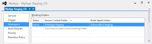 We have to change the Workspace mapping for the Staging Build Definition. It will now point to MyAppMain and it should point to MyAppStaging.