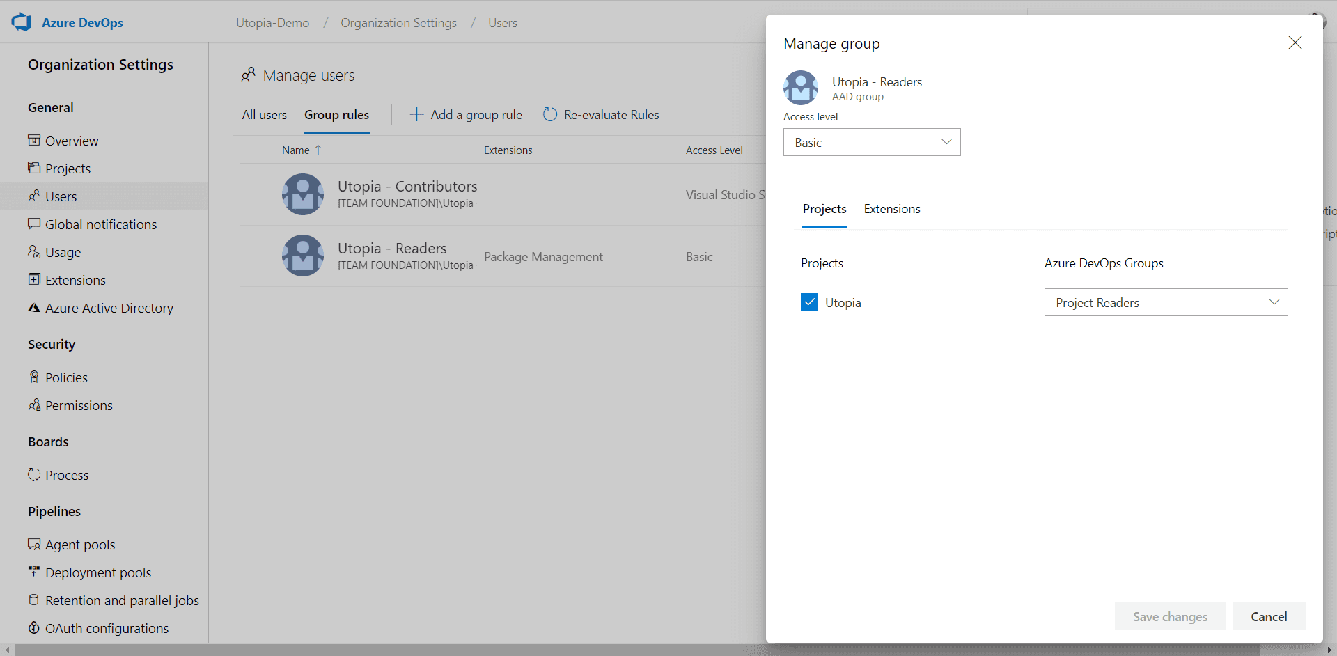 In Azure DevOps I’ve used group rules to import the users from the two AAD groups, assign an Access level and add them to a team project.
